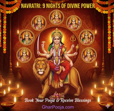 Discover the profound significance of Navratri, the nine forms of Durga worshipped, and how to perform sacred rituals. Connect with Ghar Pooja for your divine journey.